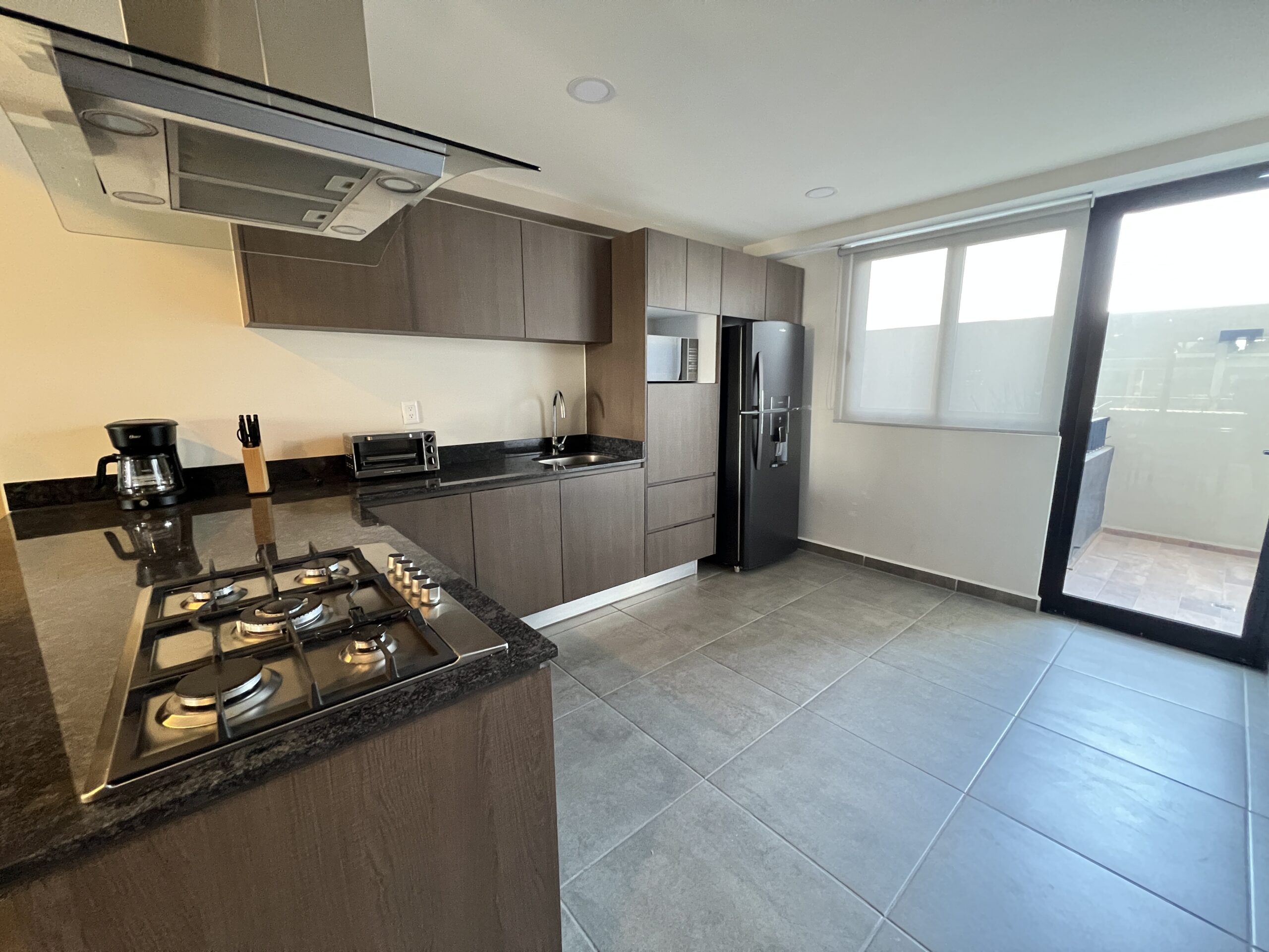 Cocina integral equipada con estufa, campana y barra de granito